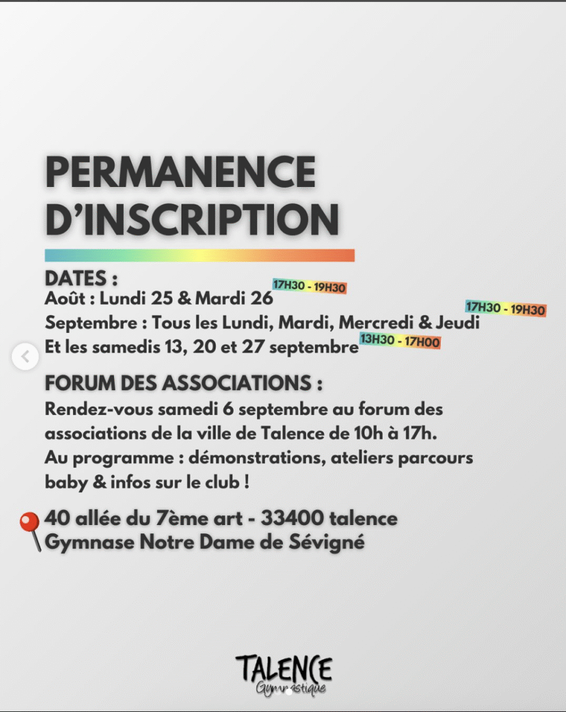 Dernière NEWS 4 septembre 2025 : Vous trouverez sur cette page les documents d’inscription mis à jour pour cette saison 2025/2026. N’hésitez pas à nous poser vos questions par mail : talencegym@gmail.com